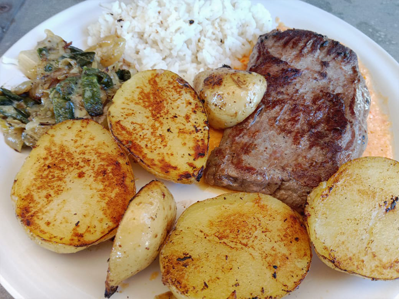 Grilled flank steak, accompanied with slices of poblano chili and gouda cheese, with cambray potatoes.