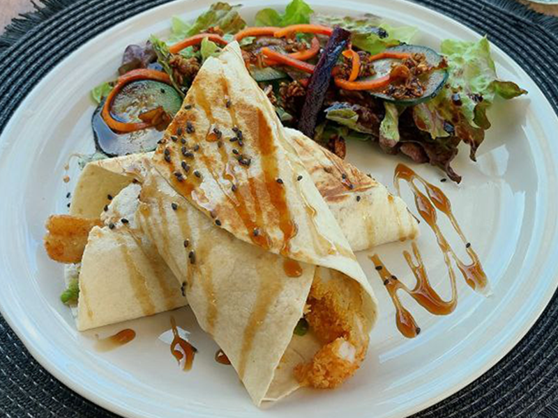 Shrimp covered in butter, gratin with gouda cheese and bathed in chipotle sauce, with flour tortilla.